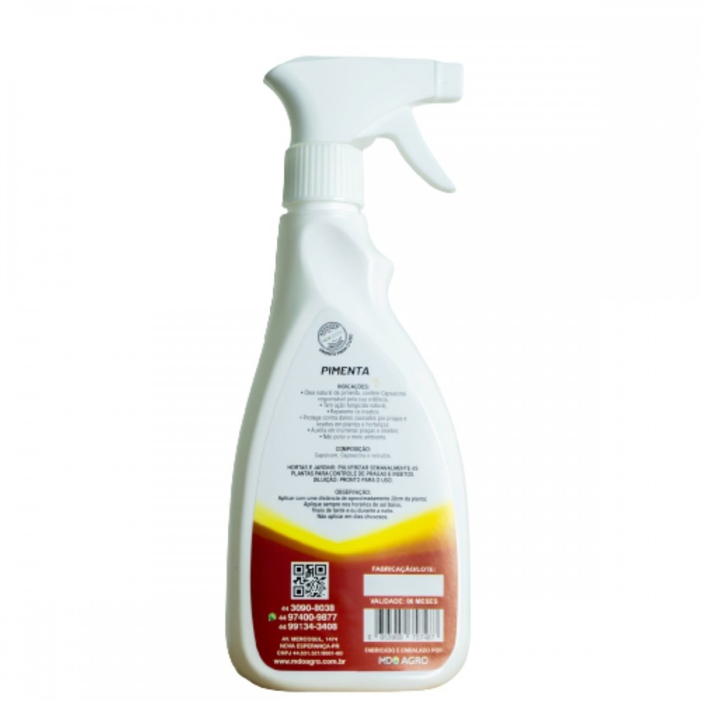 Óleo de pimenta pode ser utilizado como uma forma de controle de pragas e insetos indesejados. Alguns estudos sugerem que a capsaicina, presente no óleo de pimenta, possui propriedades inseticidas e repelentes naturais, o que pode ajudar a proteger as plantações contra danos causados por insetos e pragas.